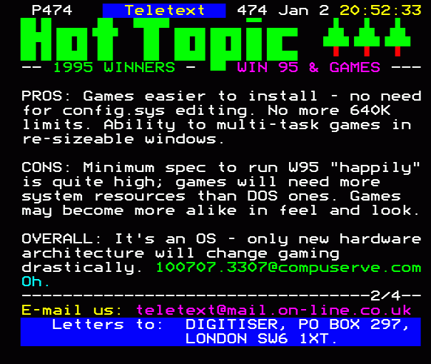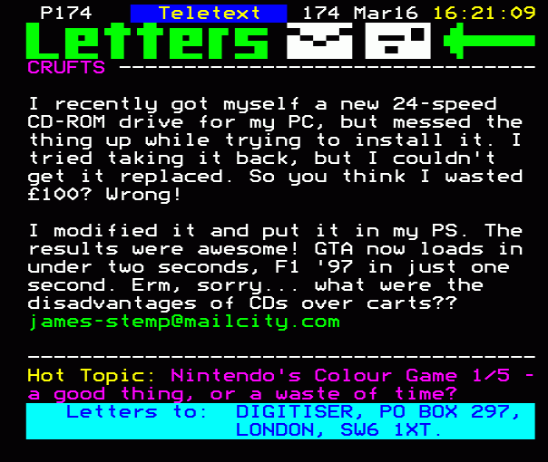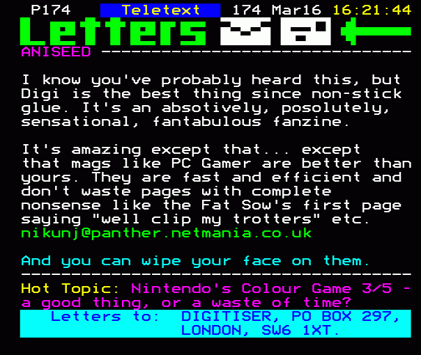 ...mail us: teletext@mail.on-line.co.uk. Letters to: DIGITISER, PO BOX 297, LONDON SW6 1XT....