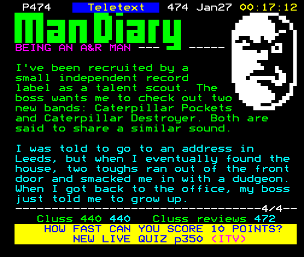...P474 Teletext 474 Dec18 00:41:14 ----------- YOUR DIGITISER GOLDEN MOMENTS --------- I think Mr Biff...