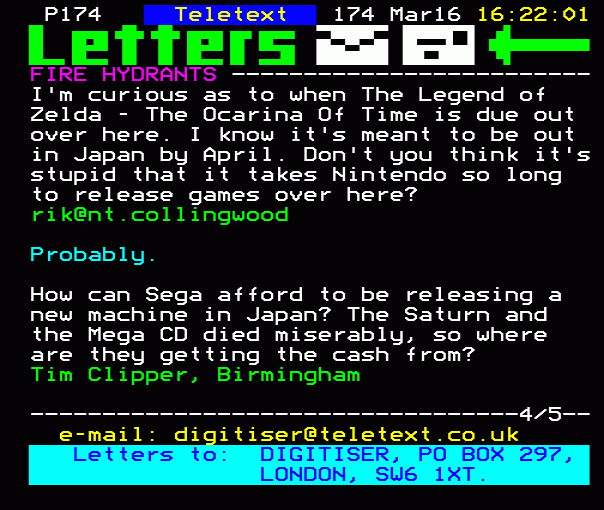 ...Will Zelda save 4/11 Nintendo's neck? Letters to: DIGITISER, PO BOX 297, LONDON SW6 1XT....