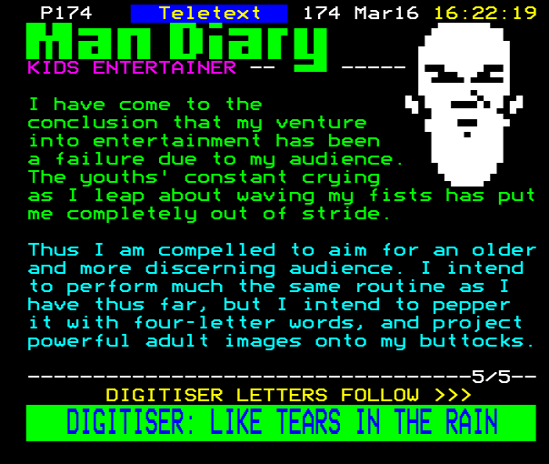 ...--------------4/5-- The Man Diary >>> Letters to: DIGITISER, PO BOX 297, LONDON SW6 1XT...