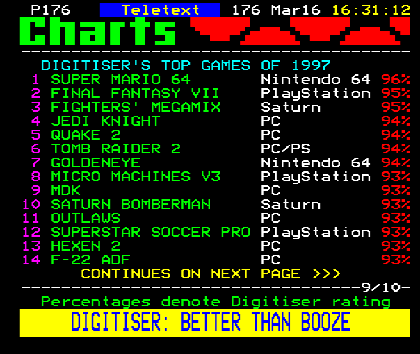 ... 01:00:36 --------------------------------------- DIGITISER'S TOP GAMES OF 1997 1 SUPER MARIO 64 Nin...