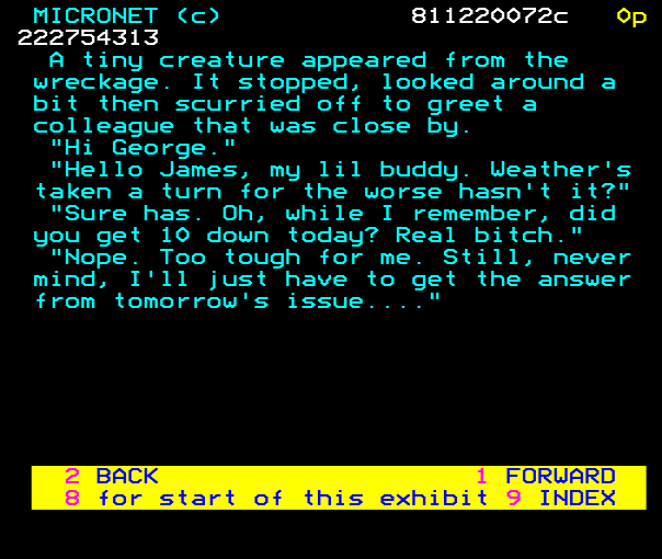 MICRONET (c) 811220072c 0p222754313 A tiny creature appeared from the wreckage. It stopped, looked around a bit then scurried off to greet a colleague that was close by. "Hi George." "Hello James, my lil buddy. Weather's taken a turn for the worse hasn't it?" "Sure has. Oh, while I remember, did you get 10 down today? Real bitch." "Nope. Too tough for me. Still, never mind, I'll just have to get the answer from tomorrow's issue...." 2 BACK 1 FORWARD 8 for start of this exhibit 9 INDEX