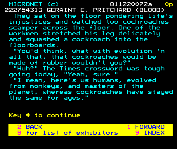 MICRONET (c) 811220074a 0p919998555 ANGUS M FRASER The loud ringing of the alarm roused her out of a heavy sleep.Letting it ring several more seconds to waken her she finally gave in and turned it off. Bathed in sweat faint recollections of a disturbing dream flitted around in her head, but she was unable to lock on to specifics.Getting up she drew the curtains and looked out at a grey morning much like many others that winter. Faint stirrings again disturbed her thoughts as she tidied the bed and got dressed.What was it? The image of breaking glass flashed through her head. Key # to continue 2 BACK 1 FORWARD 8 for list of exhibitors 9 INDEX