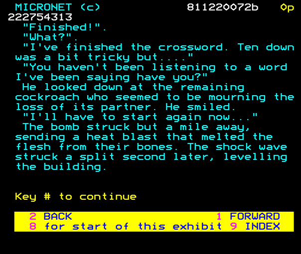 MICRONET (c) 811220038b 0p919998555 his view-scope he noted that it was still clear of any traces, as usual. Time to catch up on the local vidcomm broadcast he decided and reached for his pocket viewer. Turning it on he watched the drone repeating the same headlines between sponsors messages. Turning his head away from the screen he thought he saw the image of an echo on the scope, but looking closely at the memory trace he saw nothing important and decided it was no more than debris or a meteor which he glimpsed >>>>> Key # to continue 2 BACK 1 FORWARD 8 for start of this exhibit 9 INDEX