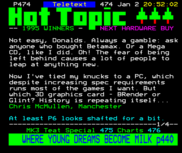 ... NEXT HARDWARE BUY Not easy, Donalds. Always a gamble: ask anyone who bought Betamax. Or a Mega CD, ...